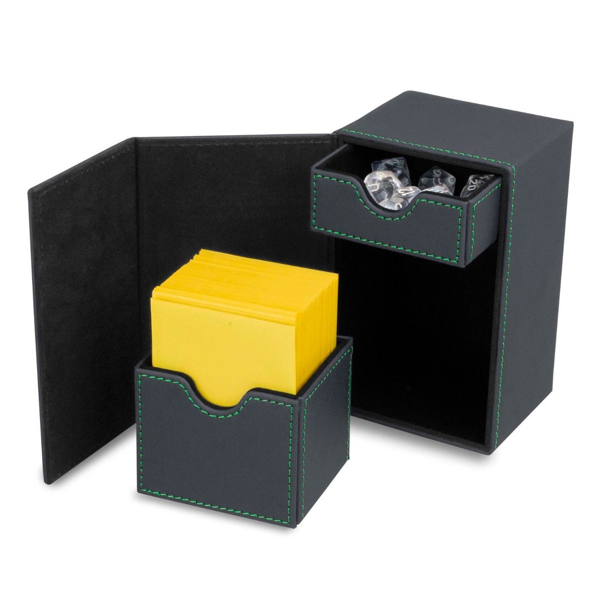 The BCW Deck Vault is built to last and will not let you down. It features a padded faux leather outer shell with a microfiber faux-suede interior. The contrasting stitching compliments its deep colour. The durable construction will keep your cards safe from damage and make sure your deck is ready for the next round. Any card game works great in the BCW Deck Vault including Magic: The Gathering, Pokemon, YuGiOh, Star Wars, Final Fantasy, and Force of Will just to name a few. The BCW Deck Vault is a hearty option for storing and transporting your collectible gaming cards with dice and tokens. It is sure to impress and intimidate your weaker opponents. Holds over 80 sleeved standard gaming cards. Blue leatherette outer shell with light blue stitching. Flip-open panel with strong magnetic closure. Removable inner deck and dice trays