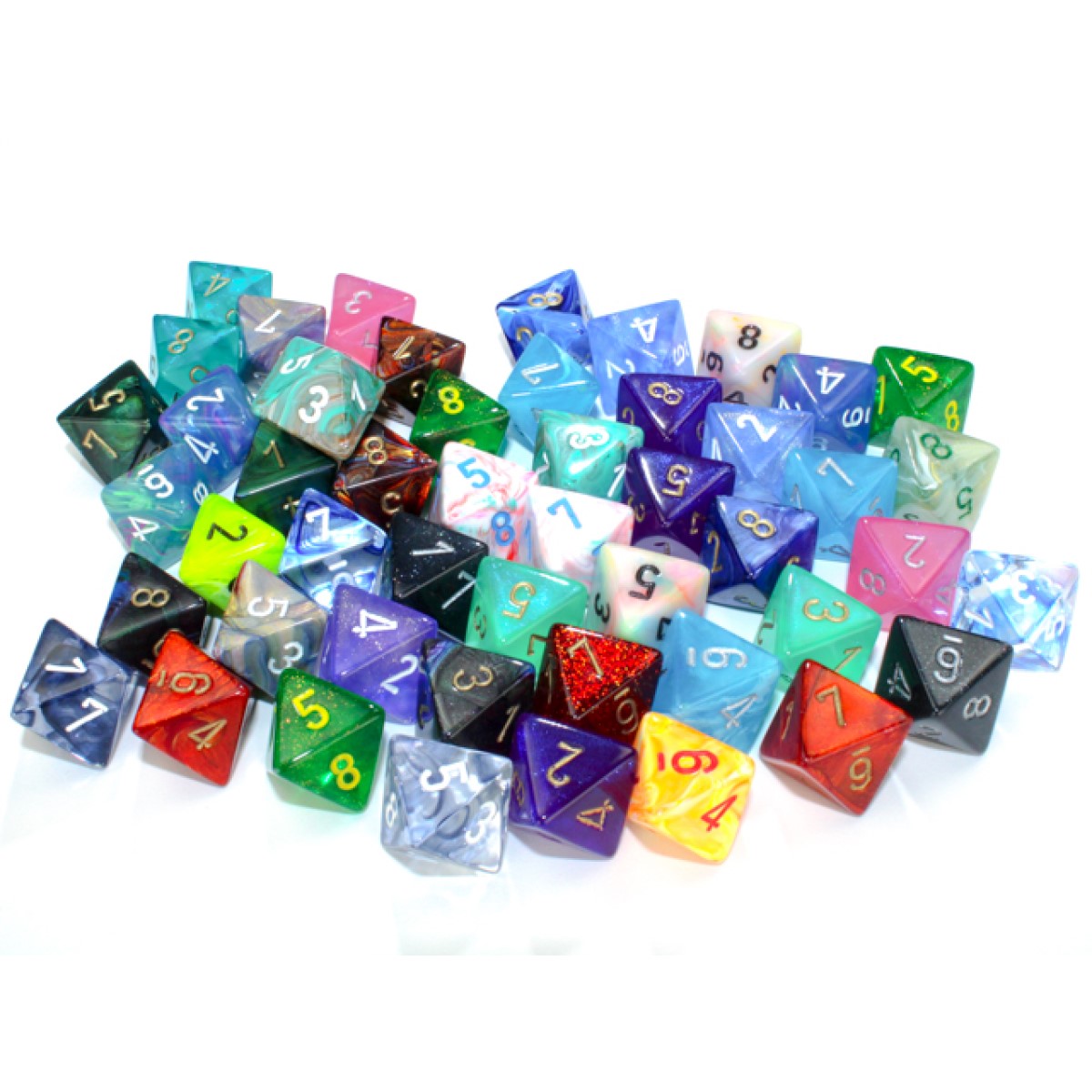Bags of fifty 16mm polyhedral, 8-sided dice will contain a variety of individual D8s from the signature range.