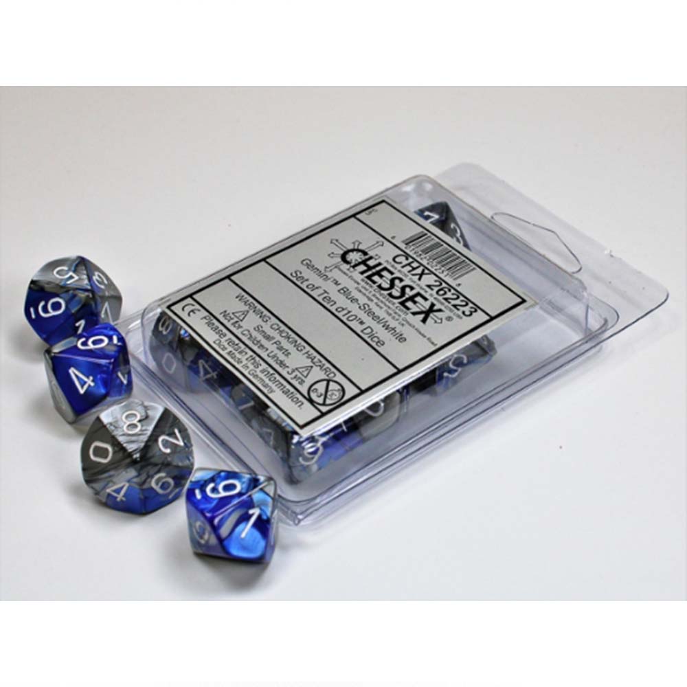Contains 10 Gemini Blue-Steel d10 dice with white numbers (PG1023) in Plastic Clamshell
