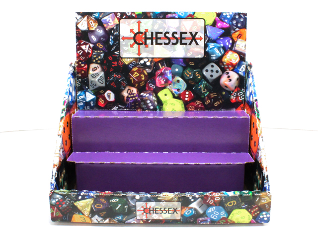 This cardboard display is empty of product but will hold up to 18 dice sets in crystal cubes. Display is printed in full color. The dimensions of the display are: 5.875″” x 9.75″” x 9.25″” (5.875″” x 9.75″” x 6.5″” w/o header) 14.93 cm x 24.77 cm x 23.5 cm (14.93 cm x 24.77 cm x 16.51 cm w/o header)