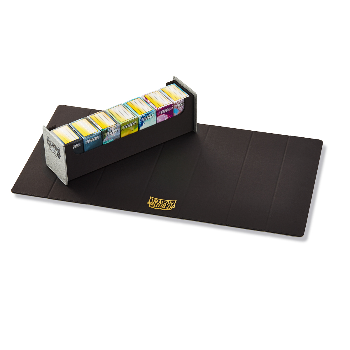 The Dragon Shield ?Magic Carpet? storage box offers an easy and stylish way to store and transport your cards. It combines elegant design and a strong magnetic seal for premium protection. The exterior can be separated from the storage tray and used as a Playmat, so you always have one handy, when you are transporting your cards. Magnetic deck box that separates into a satin lined 667x350mm (26 1/4?x13 3/4?) playmat and a deck tray. The deck tray fits: 7 Standard Dragon Shield 100 sleeve boxes or 6 Dragon Shield Deck ShellsTM or 555 sleeved cards or more than 1001 unsleeved cards! Tough ?Dragon Hide? exterior ? soft fabric interior.