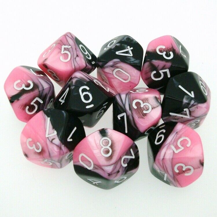 A set of Gemini Polyhedral ten d10s from Chessex, with Black-Pink background and White numbers