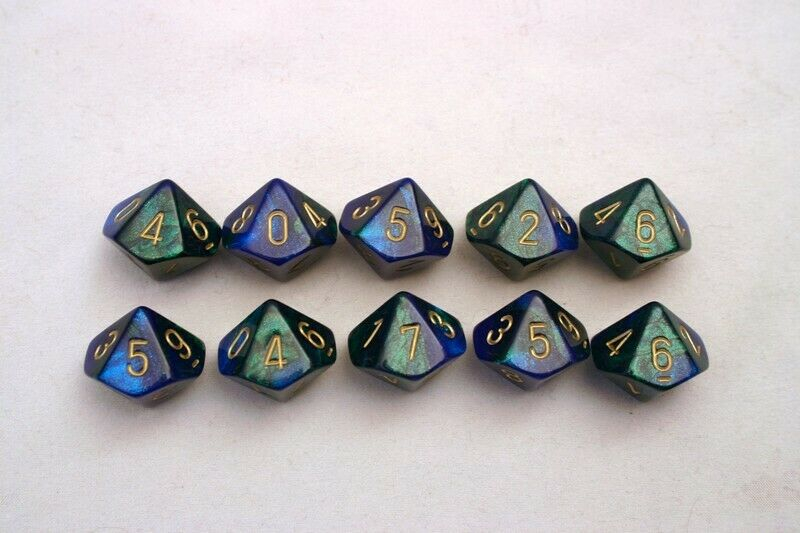 A set of Gemini Polyhedral ten d10s from Chessex, with Blue-Green background and Gold numbers