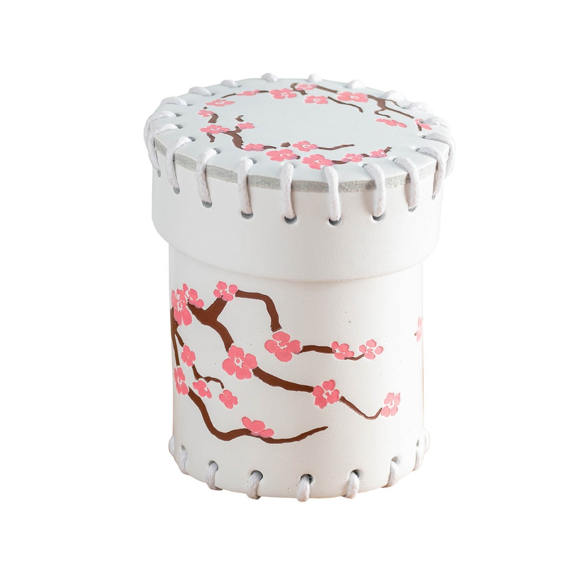 That experience has inspired us to create this Japanese Leather Dice Cup. We made it of natural leather in white color and adorned its lid and body with a colorful print; it shows a brown cherry tree branch as it’s beginning to that is starting to come to life with pink flowers!