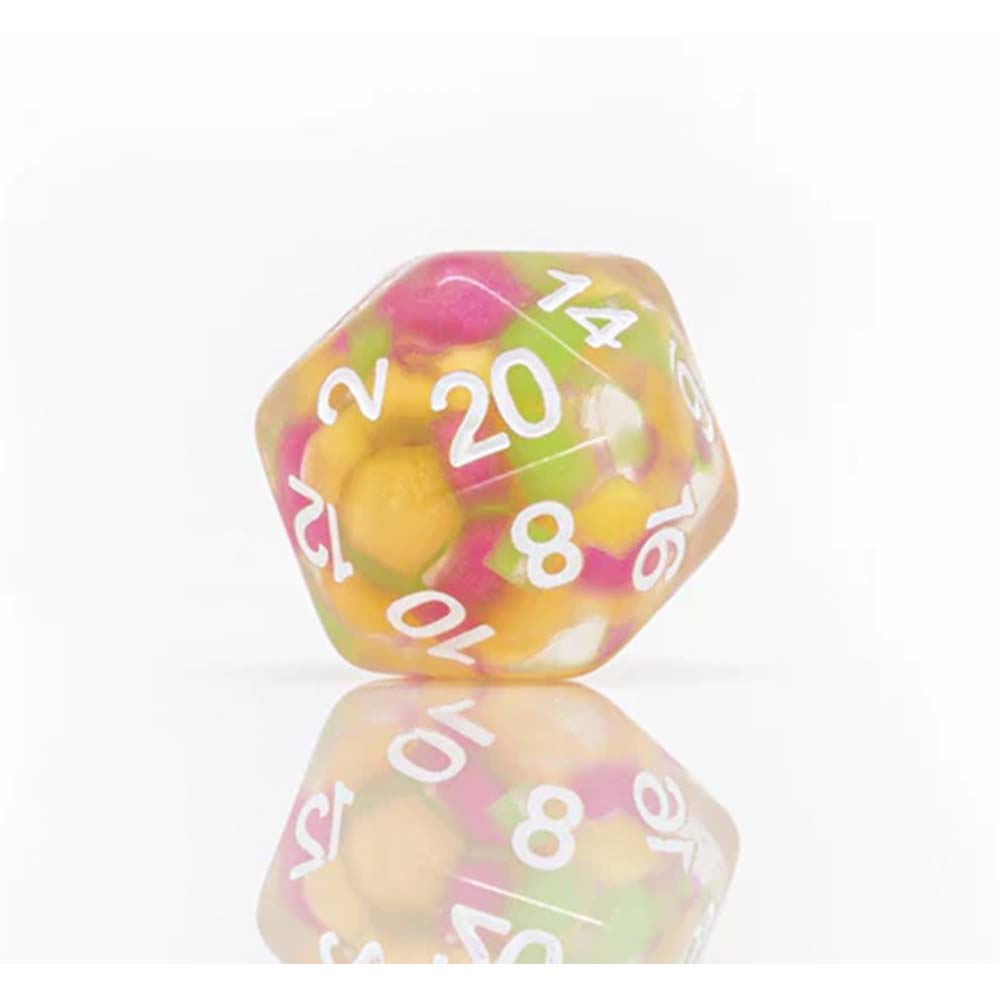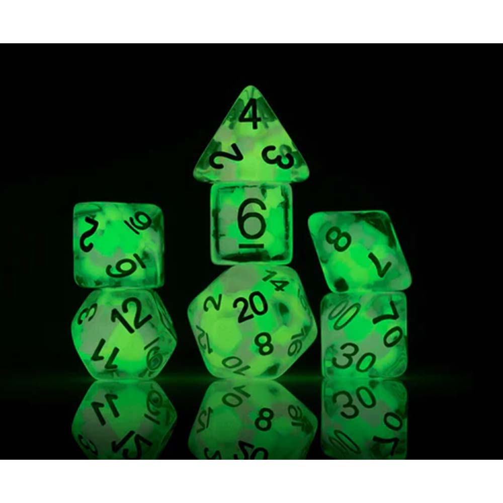 Glow-in-the-dark beads inside translucent resin. Set of 7 polyhedral dice in canteloupe and honeydew colors plus 1 extra D20. Packaged in a flat-bottom tube, so you can easily carry and store your dice.