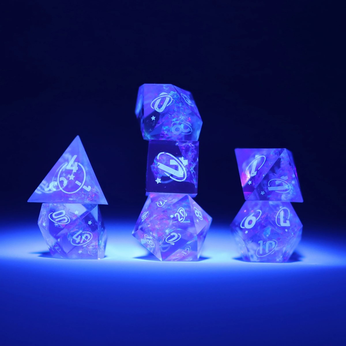 A set of 8 stunning dice. This premium set is contained in a visually pleasing plastic tube with a screw top lid. Each Dice set contains 2D20, 1D12, 1D10, 1D100, 1D8, 1D6, 1D4