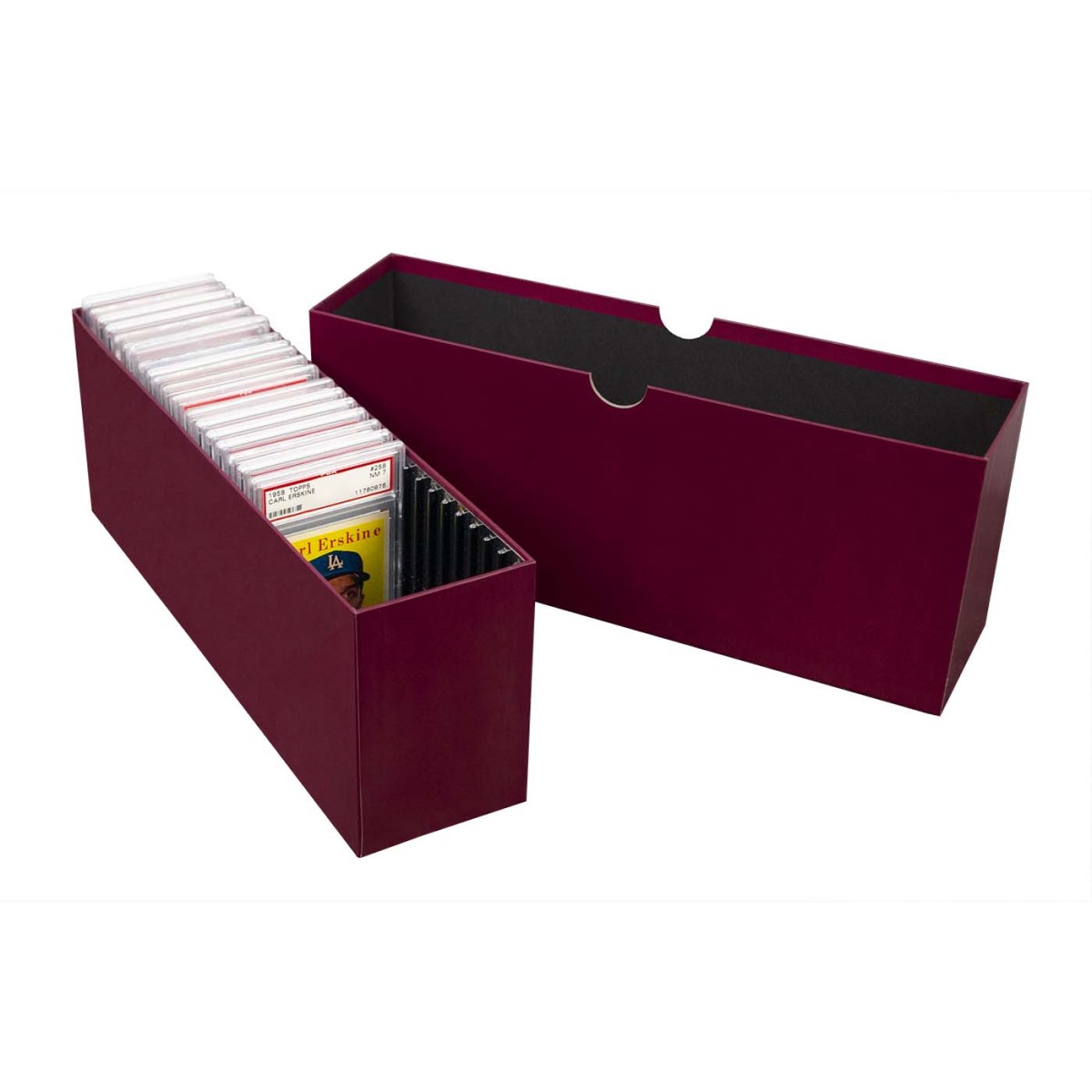 Attractive burgundy cardstock storage box. Holds twenty-six PSA graded card slabs. Special slotted sides keep your slabs accessible. Exterior Dimensions: 3 5/8 x 5 7/8 x 14 1/8. Interior Dimensions: 5 3/8 x 3 1/8 x 13 3/4. The BCW Slotted Storage Box is a sturdy, attractive box designed to safely store your collectibles and at the same time offer the ability to easily access any one piece you desire. Currently, there are several reputable and well-used grading companies in the hobby like Professional Sports Authenticators (PSA). This box works great for storing and organizing your PSA slabs.