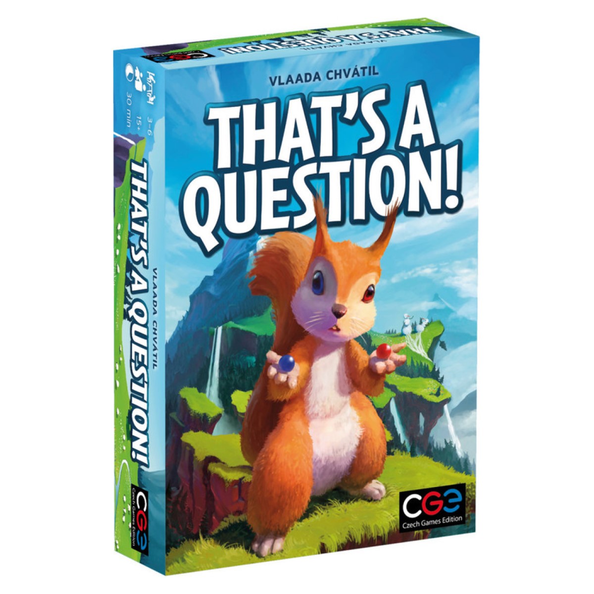The party game That’s a Question!, takes the familiar format of challenging others with questions, then voting on what they’ll say. In more detail, each player has a hand of hexagonal cards, with words or phrases in three color blocks on the card. On a turn, you choose a player that has a token in front of them, take that token, then present them with a question by choosing one of the three question prompts (which are all color-coded), then choosing two cards from your hand and adding the properly-colored section of those cards to the question. A sample question: “What would you miss more if it ceases to exist: Facebook or doors?” That player secretly votes on A or B, while everyone else but the questioner secretly votes A or B depending on how they think the person will answer; a voter can optionally add their 3x scoring token to their vote. Once everyone votes, you reveal the tiles. Everyone who voted correctly moves ahead one or three spaces on the scoring track, and the questioner moves ahead one space for each person who voted incorrectly. If you pass a certain space on the scoring track, you retrieve your 3x token (if you’ve used it). Since you can ask a question only of those with a token in front of them, everyone is asked roughly the same number of questions, and whoever has the most points after a certain number of rounds wins.
