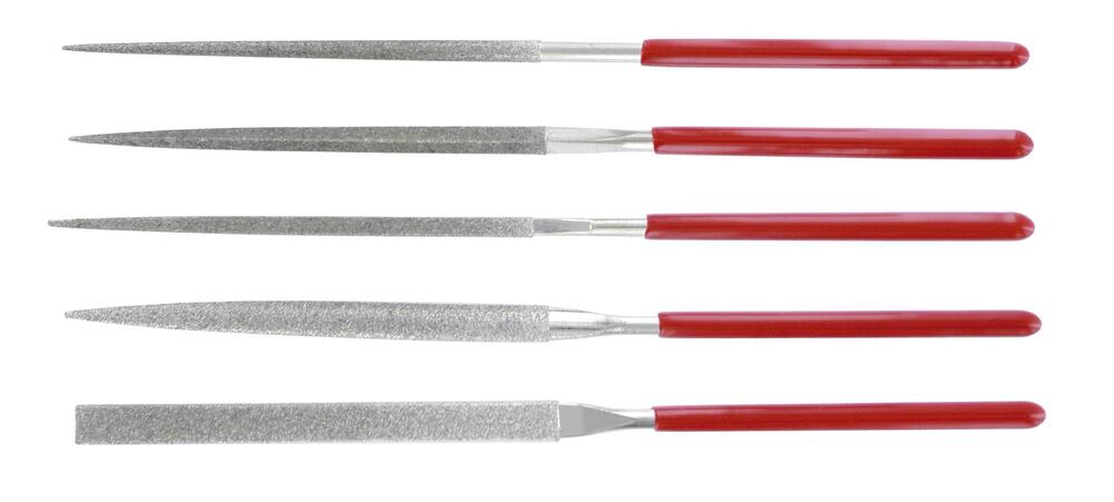 The diamond needle file set includes 5 profiles, flat, square, round, half round and triangle. These 140mm tools are excellent for precise filing tasks in plastics and metals. Longer lasting and faster working than conventional files. Diamond files stay cooler and do not clog.