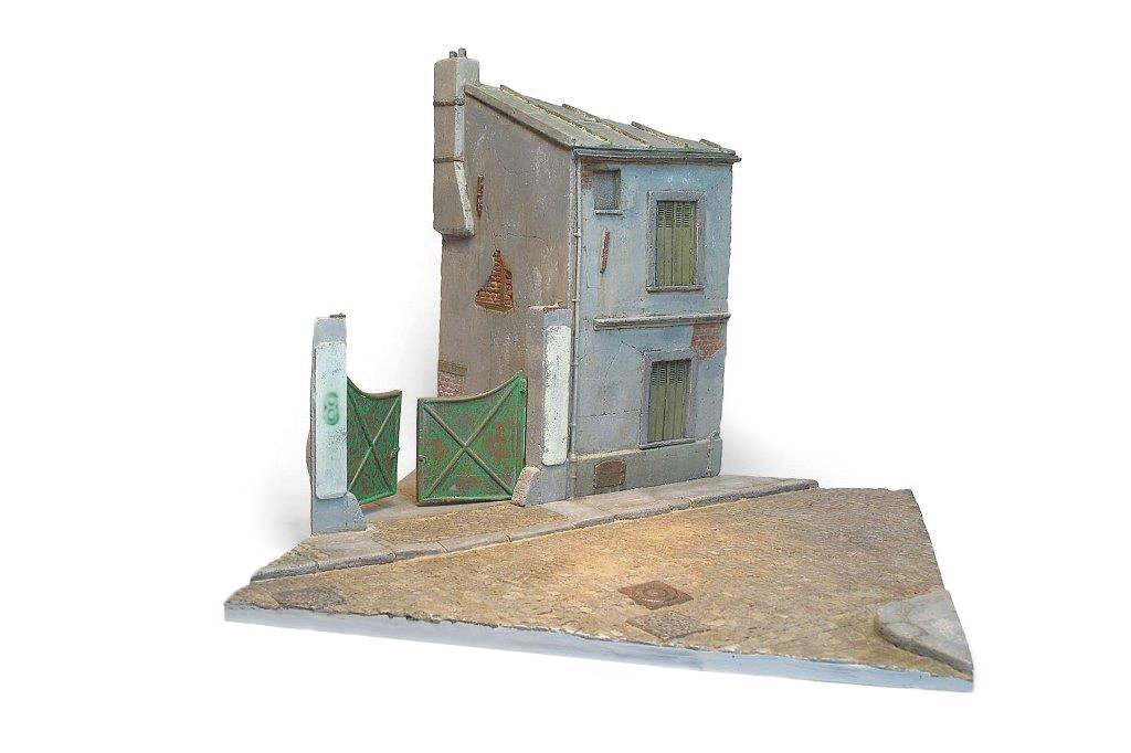 French country style street scene, with a grocery shop facade and walls, as well a paved street section, ideal for placing 1/72 scale vehicles, figures and accessories.